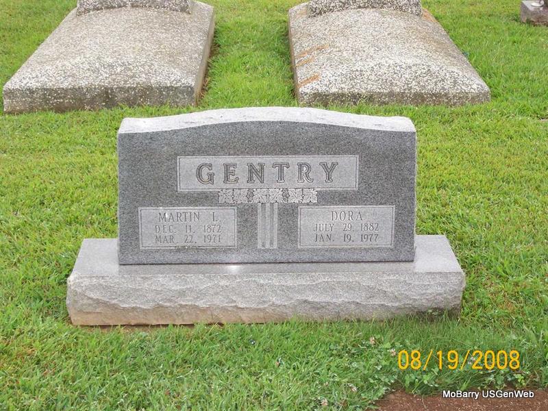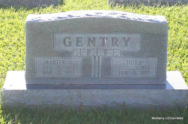SSW: Dora - Research Note: He was a retired school teacher and merchant. Son of Mark Gentry and Elizabeth Jane Loveall. His wife was Dora Hadley and she was the informant on the death certificate. Residence was Springfield, Greene Co., MO. - MO Pioneer History - "M. L. GENTRY FAMILY" Martin Luther (nicknamed Boomer) Gentry was born on a farm about six miles south of the east side of Pierce City, Dec. 11, 1872, when that town was nothing but a small village, the Frisco Railroad having reached there in 1870. The house on the farm was a one and a half story hewn log house. It must have been built as early as 1830. Uncle Millard Terry told Mr. Gentry that he (Mr. Terry) played with Mr. Gentry's half brothers, the Birkes brothers, around this house during the Civil War and that it was an old house then. It is still standing at this date (1961) and very sound. The house belongs to Arthur Meister and is located four and one-half miles northwest of Purdy and about a mile and a fourth northwest of the Stone Prairie Lutheran Church. Mr. Gentry remembers his mother and her first husband, Elias Birkes, bought the place from Pinkney Haddock in 1854 or 1855. All six Birkes children and the five Gentry children were reared in this old log house. The Gentry children were in order of ages: Alice (Mrs. Louie McNally); Boudnot, named for a Cherokee Indian Chief; M. L. Gentry (our subject); the last two children were twins, Manford E. who married Georgia Ferguson, who lives in Butterfield; Mrytle (Mrs. Pinkney Henderson). Marion Luther Gentry quotes, "I am the last leaf hanging to the tree". Mr. Gentry's mother's name was Elizabeth Jane Loveall, the 7th child of Abraham and Lucinda Walker Loveall. They came with their children out of Kentucky around up the White River on a tiny boat to Forsythe, Mo., in 1834 when Lucinda Jane was two years old. In 1846 at the age of 14 she married Elias Birkes, age 17. He is buried a short distance from the old log house, that was their home. Mrs. Birkes after the death of her first husband, Elias Birkes, who was killed at the battle of Gadfly (now Corsicana) as he fought on the Union side of the Civil War, married Mark Gentry (our subject's father). In 1896, Mr. Gentry came from Kentucky and settled near Warsaw, Mo. He joined the Union side and fought in the Civil War and during the war his wife died leaving four children. After the war ended Mr. and Mrs. Gentry reared their large family of ten in the above mentioned old hewn log one and a half story house. According to Mr. Martin Luther Gentry's study of the Gentry family, they were a prominent English family and the King of England sent a body of soldiers over to Virginia to put down Bacon's Rebellion in Colonial days. Among these soldiers were two young Gentry brothers who settled permanently in Virginia, and history teaches, that all Gentrys in the United States are descendants of these two brothers. Martin Luther Gentry and Miss Dora Hadley were married in Cassville in Jan. 1907. Dora Hadley Gentry was born and reared about five miles northwest of Cassville. She is the daughter of Sidney and Sarah (Ferguson) Hadley. Both the Hadley and Ferguson families came to Missouri from Kentucky, and were originally from England. Mrs. Gentry's grandfather's were merchants. Her grandfather, Henry Hadley, was a brother of Ex-Governor of Missouri's father. Mr. and Mrs. M. L. Gentry are parents of one child, a daughter, Eldora (Mrs. Tommy Young) of Monett, MO. Mr. and Mrs. Young are parents of one son, Jim Young, of the home. Mr. and Mrs. Gentry make their home at this writing (1961) in Springfield, Mo. Another Photo | History Death Certificate Phyllis Long Photos Jay Trace |
