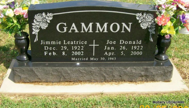 SSW: Joe Donald - Inscription: "Married May 30, 1943" - Research Note: Daughter of Oltie E. and Jessie (Johnson) Davis, married Joe Gammon on May 30, 1943, in Fort Pierce, Florida, and he preceded her in death April 5, 2000. Donna's Note: Jimmie Leatrice Gammon, age 79, of Monett, died February 8 at Cox Medical Center South in Springfield. She was born Dec. 29, 1922, in Monett, and was a daughter of Oltie E. and Jessie (Johnson) Davis. She married Joe Gammon on May 30, 1943, in Fort Pierce, Florida, and he preceded her in death April 5, 2000. The obit reads that she was a son of Oltie and Jessie - should have read daughter. | Monett Times Feb. 11, 2002 Mary Homesley Note Obit Donna Cooper Photo Jay Trace |