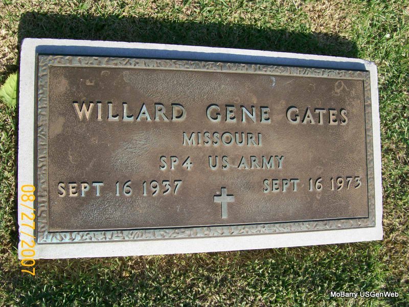 | GATES, Willard Gene | Sept. 16, 1937 | Sept. 16, 1973 | Inscription: "MISSOURI SP 4 US ARMY" - Research Note: Son of Arthur Bellmer Gates and Mattie L. Beymer. | Census Phyllis Long Photo Jay Trace |