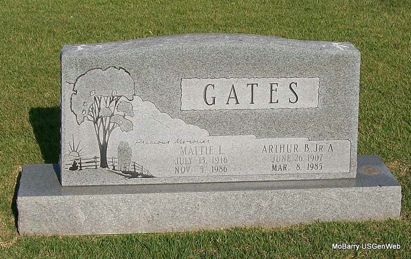 | GATES, Mattie L. (BEYMER) | July 13, 1916 | Nov. 5, 1986 | SSW: Arthur B. - Research Note: Daughter of Claud Ammon Beymer and Icy Belle Goodnight. Mattie Beymer, age 18, married Arthur B. Gates, age 27, on Aug. 11, 1934 in Mt. Vernon, Lawrence Co., MO. | MO Marriage Records Census Phyllis Long Photo Jay Trace |