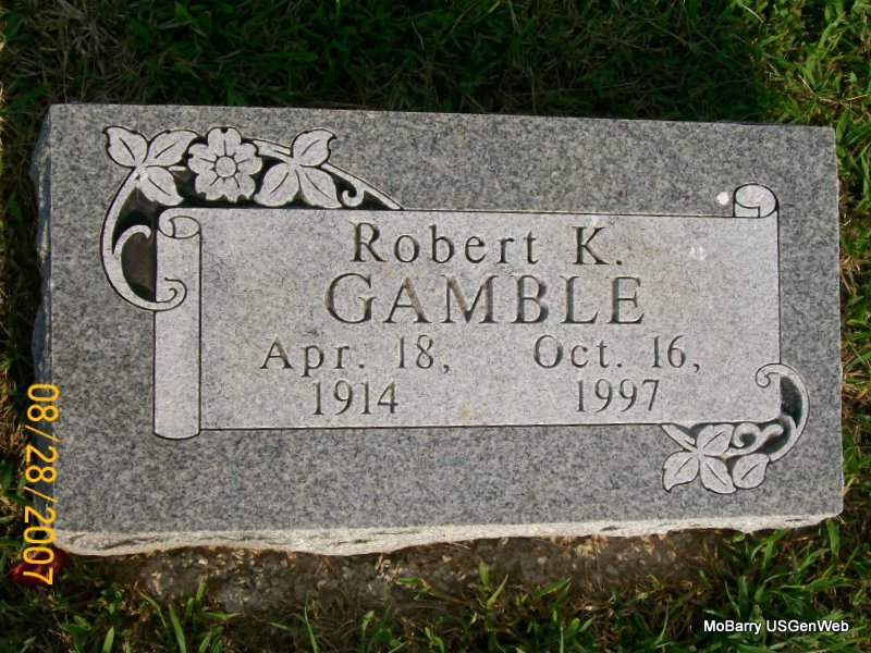 | GAMBLE, Robert K. | Apr. 18, 1914 | Oct. 16, 1997 | Research Note: Public Records give his address as 203 Pattie St., Wichita, KS but doesn't give a date. | Public Records Phyllis Long Photo Jay Trace |