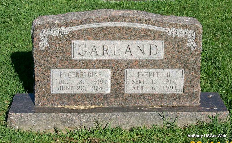| GARLAND, E. Geraldine (MILLER) | Dec. 3, 1919 | June 20, 1974 | SSW: Everett H. - Research Note: Geraldine Miller, age 21, married E. H. Garland, age 24, on May 29, 1939 in Greenfield, Dade Co., MO. Daughter of Delbert and Vera Miller. | MO Marriage Records Census Phyllis Long Photo Jay Trace |