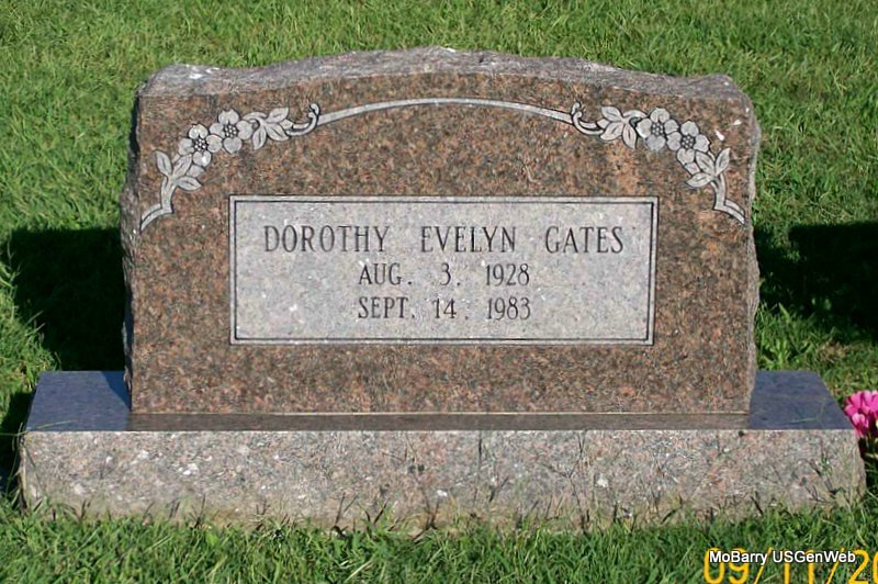 | GATES, Dorothy Evelyn (HENDRICKS) | Aug. 3, 1928 | Sept. 14, 1983 | Research Note: She is buried next to William Herman Gates and Mamie Gladys Henderson, her parents. | Census Phyllis Long Photo Jay Trace |