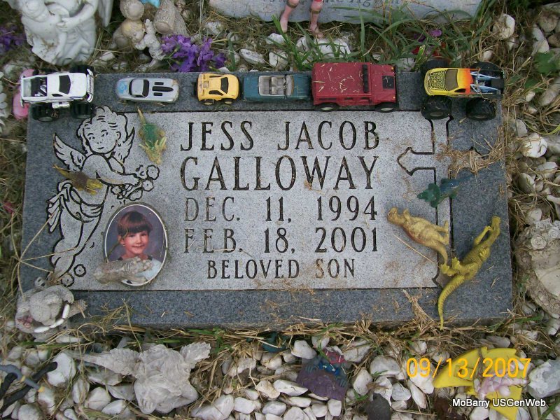 Feb. 18, 2001 | Inscription: "Beloved Son" - Research Note: Jess Jacob Galloway, 6, of rural Monett, was pronounced dead Feb. 18, 2001, from injuries sustained in a fire. He was born Dec. 11, 1994, in Springfield. He had lived in the Monett area his whole life, attended New Site Baptist Church, and was a kindergarten student at Monett Elementary School. He was a son of Jesse L. and Laura Galloway. The body was cremated and burial in Monett IOOF. | Monett Times Feb. 20, 2001 Donna Cooper Photo Jay Trace |