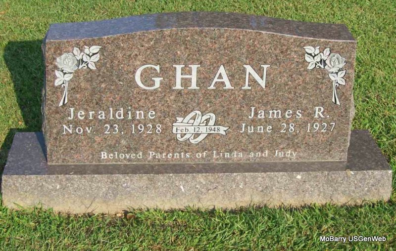 SSW: Jeraldine - Inscription: "Feb. 12, 1948" - Research Note: Son of Hershel James Ghan and Edith Atkin Boyce. He was a self-employed heavy equipment operator and a farmer. He was a member of the First Baptist Church in Monett, Masonic Lodge, for fifty years and a Past President of the Freistatt Lions Club. Jim was united in marriage on February 12, 1948 in Berryville, AR, to Jeraldine "Jerry" McCullough, spending over sixty-six years together, Jerry preceded him in death on April 27, 2014. To this union, two daughters were born. Jim was preceded in death by his parents; and one brother, Clyde Ghan. | Census Buchanan Funeral Home Phyllis Long Photo Jay Trace |