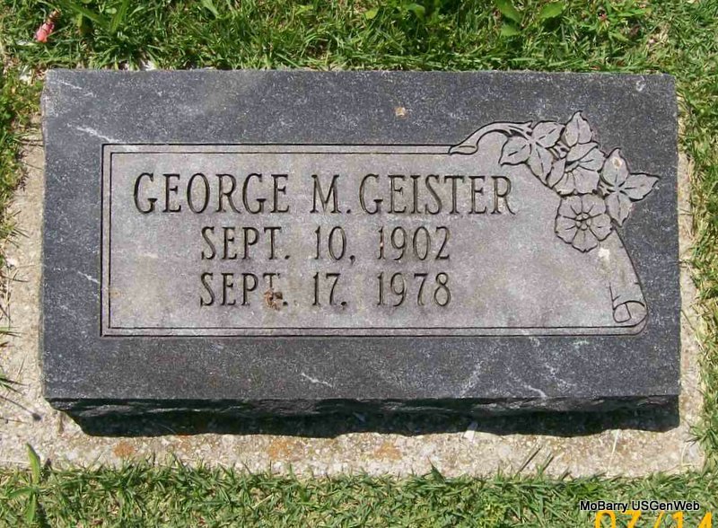 | GEISTER, George M. | Sept. 10, 1902 | Sept. 17, 1978 | Research Note: His wife was Ruth J. Fly. Son of Albert Geister and Garnet Wood. - Headstone - Geister Plot - Another Photo | Census MO Marriage Records Phyllis Long Photo Donna Cooper Photo Jay Trace |