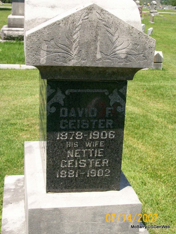 SSW: David F. - Inscription: "His Wife" - Research Note: Callaway Funeral Home Records state that her husband's name was D. F. and that she was age 21 years, 8 months and 8 days old. The funeral was at the Presbyterian Church. Miss Nettie Pate married D. F. Geister on Jan. 3, 1902 in Newton Co., MO. - 1900 Census, Neosho, Newton, Missouri - Wallace Childs, head, born July 1852 IN, lawyer; Nettie Pate, inmate, birth date unknown, age 20, born MO, parents born IN; many others also listed as "inmate". | Note Donna Cooper MO Marriage Records Phyllis Long Photo Jay Trace |