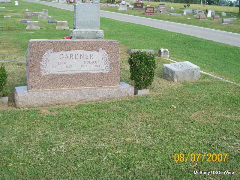 | GARDNER, Horace A. | 1883 | 1974 | SSW: Etta - Research Note: Son of Logan W. and Sarah Belle (Dixon) Gardner. Horace was a prominent lawyer in Monett, MO. - Cassville Republican, Thursday, May 8, 1919 - The Monett Times states that an attempt was made one night last week to steal H. A. Gardner's automobile. Mrs. Gardner was awakened by the noise when the thieves were trying to break the lock on the garage door. Mr. Gardner spoke to the men and they fled. - 1920 Census Missouri - Barry - Monett Ward 1 - District 4 - Horace Gardner, age 36, born MO, parents born KY, Lawyer; Etta, wife, age 33, born MO, parents born MO; Jo, son, age 7, born MO. - Another Photo | Online Newspapers Phyllis Long Photos Jay Trace |