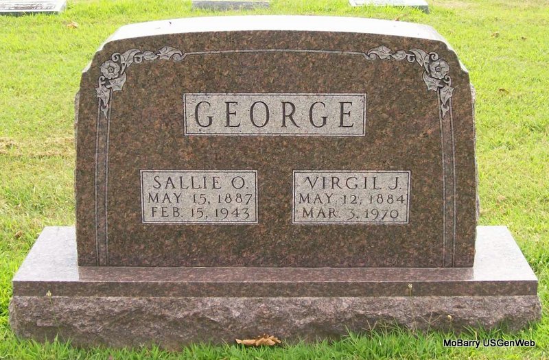 SSW: Sallie O. - Research Note: Son of Joseph W. George and Ellen Lucina Saxton. His wife was Sallie Brownfield and he worked for the railroad and farmed. Residence was Monett, Barry Co., MO. Mrs. Mildred Katz and Westchester, IL was the informant on the death certificate. | Census Death Certificate Phyllis Long Photo Jay Trace |