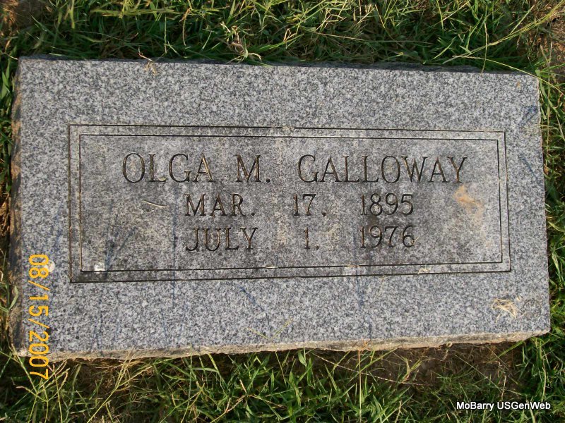 | GALLOWAY, Olga M. (HESS) | Mar. 17, 1895 | July 1, 1976 | Research Note: Second wife of Charles Galloway. Daughter of John Hess and Emma Lydia Kuester. | Census Phyllis Long Photo Jay Trace |