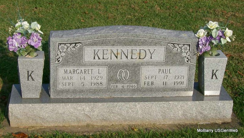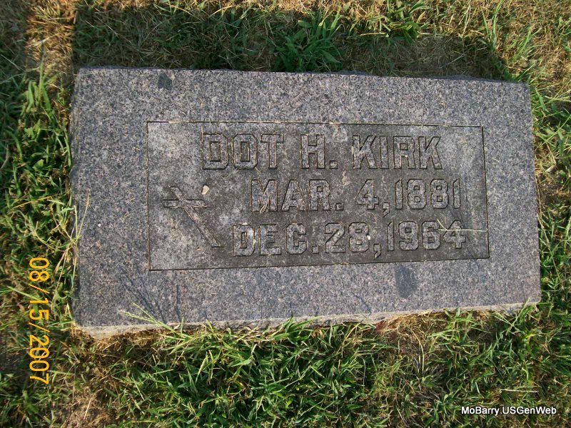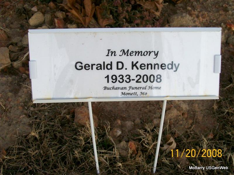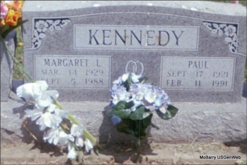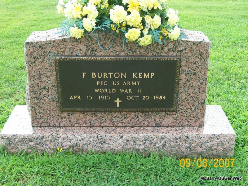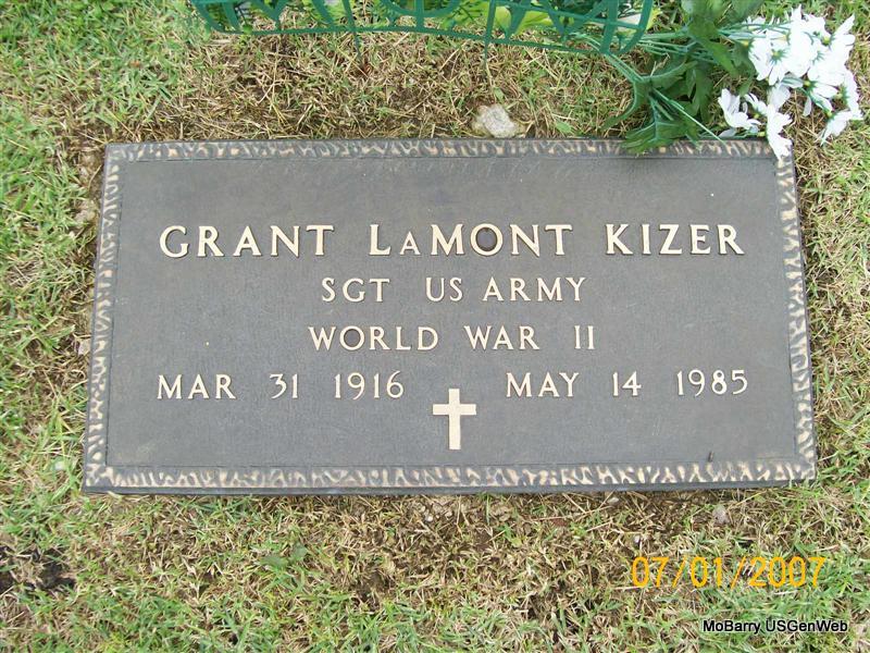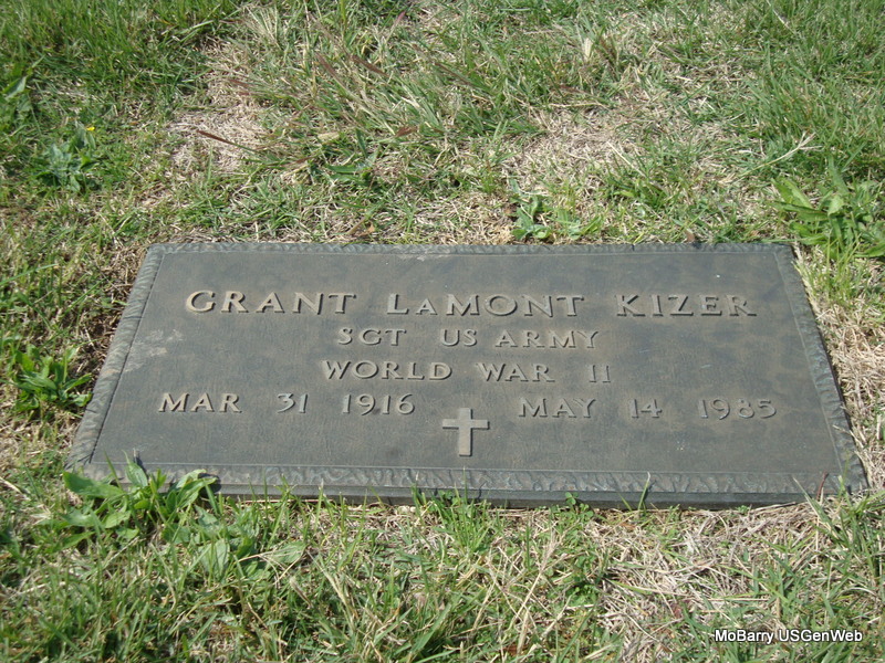 | KIZER, Grant Lamont | Mar. 31, 1916 | May 14, 1985 | Inscription: "SGT US ARMY WW II" - Research Note: According to the cemetery log book James S. Johnston purchased the cemetery lot. The funeral home was Amick of Chaffie, MO. He is buried next to Imogene Kizer, his wife. - Another Photo | IOOF Log Book Phyllis Long Photo Connie Schmidt Photo Jay Trace |