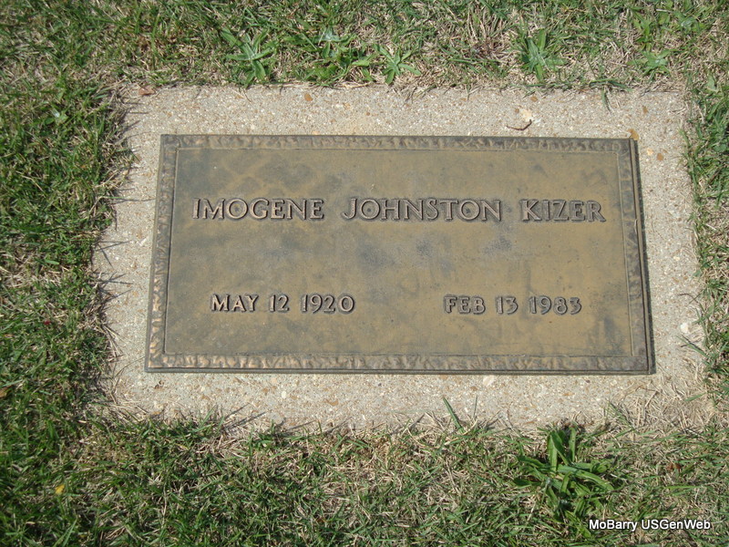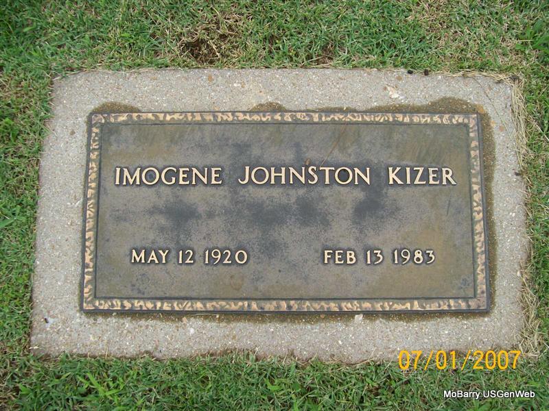 | KIZER, Imogene Collene (JOHNSTON) | May 12, 1920 | Feb. 13, 1983 | Research Note: According to the cemetery log book James S. Johnston purchased the cemetery lot. The funeral home was Ford at Cape Girardeau, MO, and reads she was a veteran, which could possibly be in error. She is buried next to James and Artie (McMinn) Johnston, her parents. - Another Photo | IOOF Log Book Phyllis Long Photo Connie Schmidt Photo Jay Trace |
