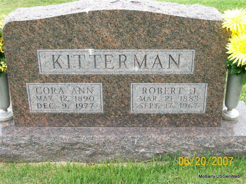 SSW: Cora Ann - Research Note: This couple is buried next to Thelma (Kitterman) Jaques, their daughter. Thelma's obit listed her as Thelma Olson and her stone reads Thelma (Kitterman) Jaques. Thelma also married Rudolph M. Olson at age 49 in 1960 in CA. Divorced from him in 1967 in CA. Robert J. Kitterman married Cora A. Stevens on Mar. 18, 1908 in Harrison Co., IN. Parents named as John Wesley Kitterman and Sarah Ellen Smith. His wife Cora was the informant on the death certificate. | Note Donna Cooper IN Marriage Records Census Death Certificate Phyllis Long Photo Jay Trace |