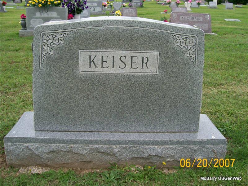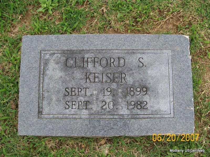 | KEISER, Clifford S. | Sept. 19, 1899 | Sept. 20, 1982 | Research Note: Son of Louis Jackson Keiser and Rebecca Jane Craven. His wife was Lois Hays.- Keiser Plot Stone | Census Phyllis Long Photo Jay Trace |