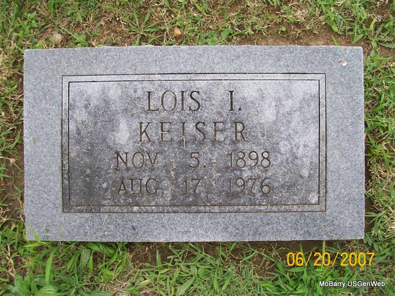 | KEISER, Lois Ivy (HAYS) | Nov. 5, 1898 | Aug. 17, 1976 | Research Note: Her maiden name was given on her son's death certificate. Daughter of Payton Cooper Hays and Mary Alice Lewis. - Keiser Plot Stone | Census Phyllis Long Photo Jay Trace |