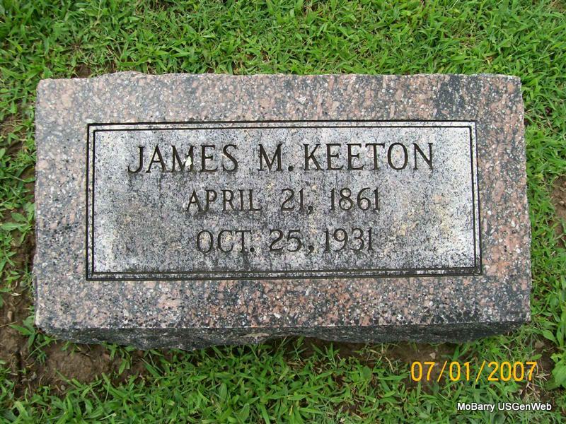Research Note: His death certificate states that George Cornelius Keeton, born in TN, was his father and his mother was given as Julia A. Keith, born Harrison, AR. Julia second married Robert Frank Smith. James died from the effects of heart disease. H. A. Keeton, Verona, MO, gave the information. - Wives: Ruth (Underwood) Keeton, Miranda C. (Underwood) (Cravens) Keeton, Hannah Emma (May) (Massie) Cook. J. Keeton, age 41, married Miranda (Underwood) Cravens, age 30, on Nov. 25, 1902 in Lawrence Co., MO. James M. Keeton, age 53, married Emma Massie, age 40, on Aug. 2, 1914 in Barry Co., MO. There is a listing for Emma (May) (Keeton) Cook, born 1873, in Maplewood Cemetery. | Death Certificate Donna Cooper MO Marriage Records Census Phyllis Long Photo Jay Trace |