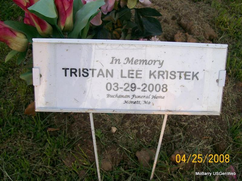 Research Note: Tristan Lee Kristek, daughter of Randy and Cheryl Ann Kristek of Monett, died March 29, 2008. She was born March 29, 2008. Graveside services were held at 10 a.m. yesterday, April 2, at Monett IOOF Cemetery with Dana Taylor, pastor, officiating under the direction of Buchanan Funeral Home of Monett. | Monett Times Apr. 3, 2008 Donna Cooper Photo Jay Trace |