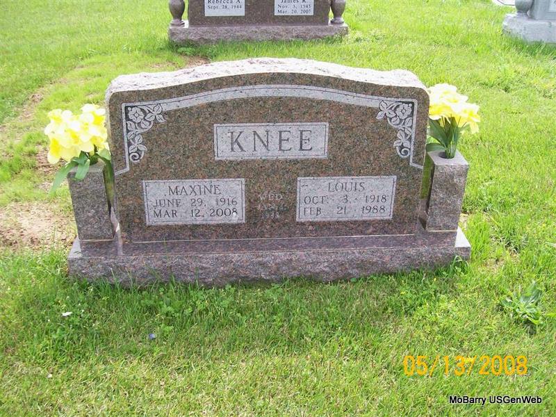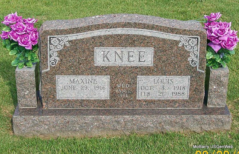 SSW: Louis - Inscription: "Wed Jan 1, 1938" - Research Note: She was a daughter of Bert and Rosetta (Long) Etter. She married Louis K. Knee, and he preceded her in death February 21, 1988. She was preceded in death by three brothers, Orbie Etter, Elzie Etter, and Doyle Etter. - Another Photo - Back of Stone | Monett Times Photos Jay Trace |
