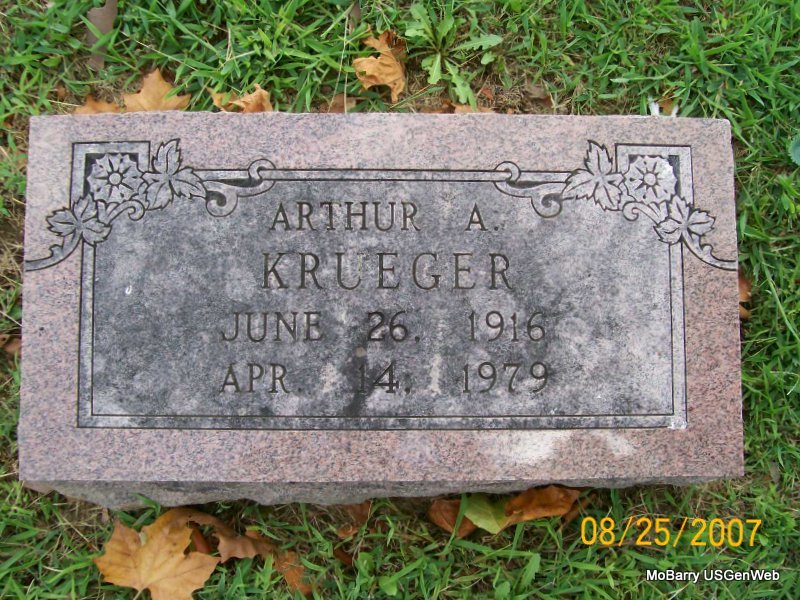 | KRUEGER, Arthur A. | June 26, 1916 | Apr. 14, 1979 | Research Note: Son of Theo and Joanna Krueger. His wife was Gladys Conway. | Census Phyllis Long Photo Jay Trace |