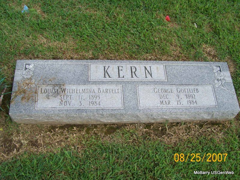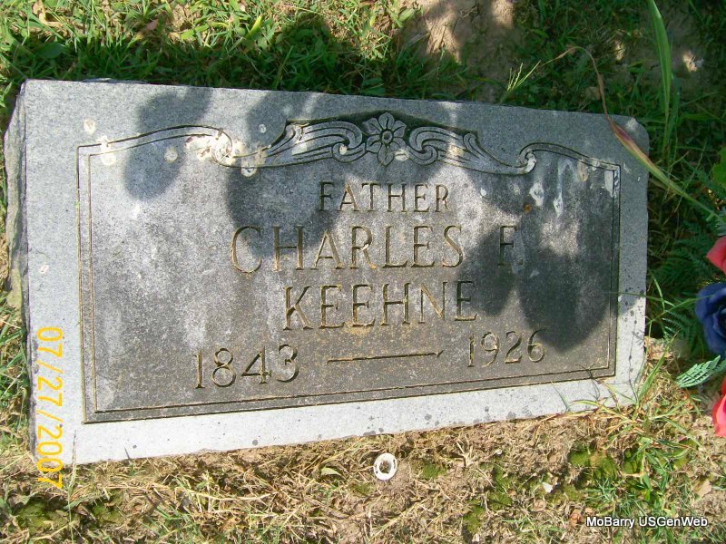 Inscription: "Father" - Research Note: His death certificate is indexed incorrectly by the SOS web site as Kechne. His birth year is given as 1847 and not 1843 as the stone reads on the certificate. The cause of death was strangulated hernia? followed by gangrene. His father was Keehne born Germany and his mother Sophia C. Keehner, born Germany. Mrs. W. S. Leater, Monett, MO, was the informant. | Death Certificate Donna Cooper Photo Jay Trace |