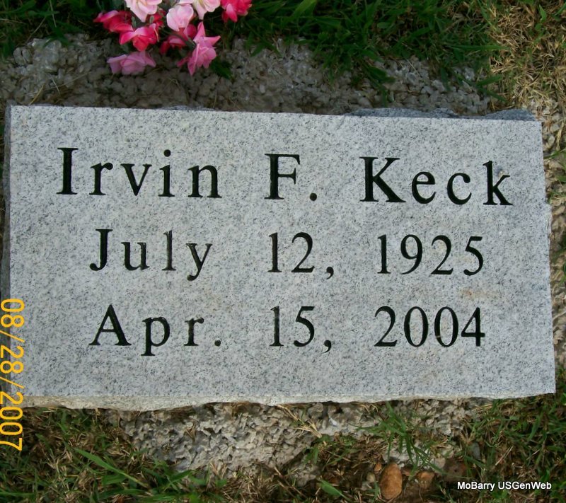 Resource Note: Irvin Francis Keck, age 78, of Monett, died April 15, 2004, at St. John's Regional Medical Center in Springfield following a long illness. He was born July 12, 1925, in Oakdale, NE, and was a son of Clyde and Helen (Meyer) Keck. He was a retired foreman at EFCO Corporation in Monett and was retried from Keck Service Center in Monett. He was a member of the First Baptist Church in Monett where he was an usher. He married Wilma Martin on June 29, 1979, in Miami, OK. He was preceded in death by one daughter, Marilyn Keck, on February 21, 1988. - Irvin Francis Keck, age 37, married Helen Louise (Coatney) Boothe, age 36, on Nov. 18, 1962 in Wheaton, Barry Co., MO. The cemetery log book reads that he was cremated. | Monett Times, April 16, 2004 Donna Cooper IOOF Log Book MO Marriage Records Phyllis Long Photo Jay Trace |
