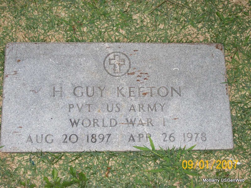 | KEETON, Horace Guy | Aug. 20, 1897 | Apr. 26, 1978 | SSW: Hallie M. - Inscription: "Married Oct. 21, 1918" - Research Note: The cemetery log book has his name as Horace Guy. Son of James Madison Keeton and Ruth Ellen Underwood. - Another Photo - Military Stone - Inscription: "PVT US ARMY WORLD WAR I" | IOOF Log Book Note Phyllis Long Photos Jay Trace |