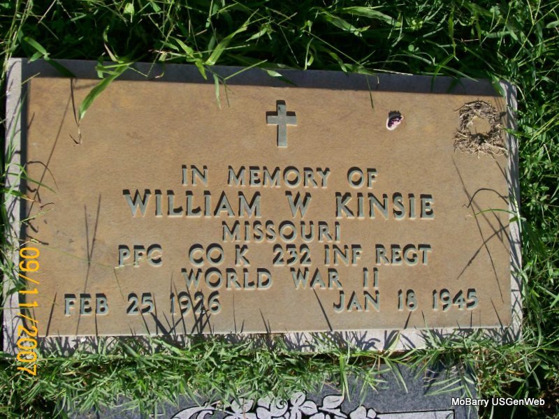| KNEE, Aaron E. | Apr. 1, 1924 | Apr. 4, 1945 | Inscription: "MISSOURI T SGT 775 AAR BOMB SQ WORLD WAR II" - Research Note: Son of Elmer Knee and Haley McMullin. He enlisted on May 28, 1943. Apparently killed in WW II. | Census Phyllis Long Photo Jay Trace |