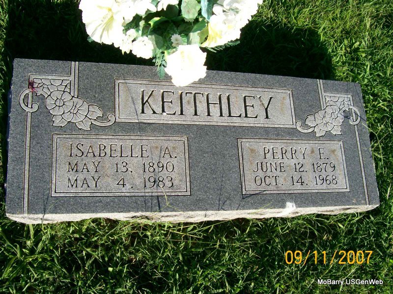 SSW: Isabelle A. - Research Note: He first married E. J. Young Oct. 18, 1901 in Cassville, Barry Co., MO. Perry E. Keithley, age 31, married Isabel Agnes Scott, age 25, on May 3, 1911. Son of William Scott Keithley and Martha J. Hagler. Isabel was the informant on the death certificate. Usual residence was Monett, MO. He was a retired plumber. | MO Marriage Records Census Death Certificate Phyllis Long Photos Jay Trace |