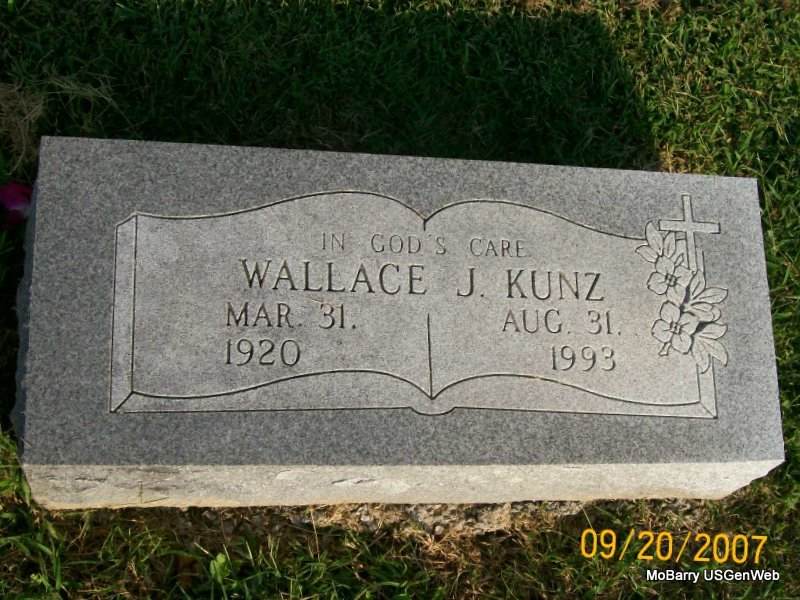 | KUNZ, Wallace James | Mar. 31, 1920 | Aug. 31, 1993 | Inscription: "In God's Care" - Research Note: Wallace James Kunz, age 60, married Elta N. Paris, age 65, on Oct. 10, 1980 in Purdy, Barry Co., MO. | MO Marriage Records Phyllis Long Photo Jay Trace |