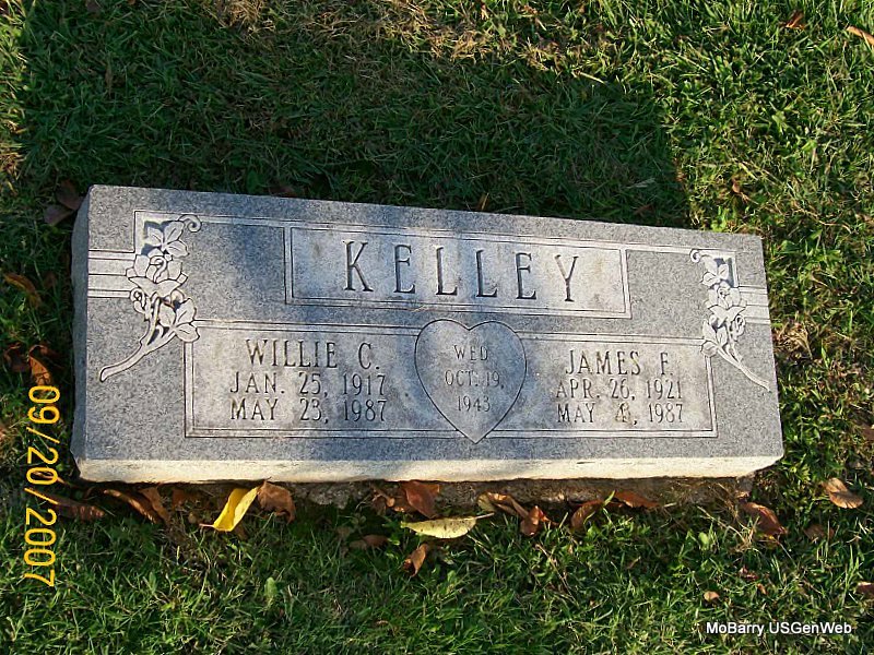 | KELLEY, James Frank | Apr. 26, 1921 | May 4, 1987 | SSW: Willie G. - Inscription: "Wed Oct. 19, 1943" - Research Note: The cemetery log book has his name as James Frank Kelley. | IOOF Log Book Phyllis Long Photo Jay Trace |