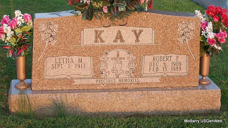 SSW: Robert F. - Research Note: She was the daughter of Amos and Adline (Coker) Littlejohn. On January 25, 1936, Robert Franklin and Letha Mae (Littlejohn) Kay were united in marriage in Okmulgee, OK. They celebrated over fifty-three years of marriage before he preceded her in death on Feb. 13, 1989. To this union four sons were born. Rob and Letha moved the family to Monett in 1964 where they established Kay Concrete. Letha was preceded in death by two sons, Bob R. Kay and infant son, Billy Joe Kay. | Funeral Home Phyllis Long Photo Jay Trace |