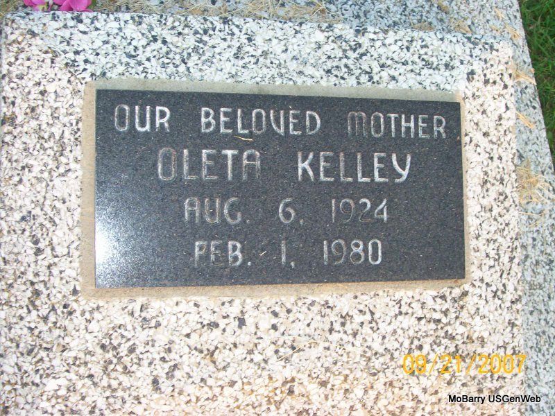 | KELLEY, Oleta | Aug. 6, 1924 | Feb. 1, 1980 | Inscription: "Our Beloved Mother" - Research Note: Wife of James Raymond Kelley. | Note Phyllis Long Photo Jay Trace |
