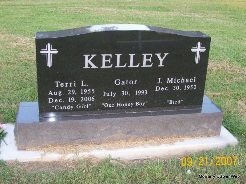 SSW: Terri L. and Gator - Inscription: "Bird" - Research Note: Son of the late James Raymond "Unk" Kelley and Oleta Cora (Hammers) Kelley. Growing up in Monett, Mike graduated from Monett High School with the class of 1971. During his school years, Mike enjoyed playing baseball and was a great basketball player, scoring a career high 42 points in a single game. Mike carried his love of sports throughout his life and was an avid Springfield Cardinals fan. Mike was also an animal lover and was especially fond of his dogs. Following high school, Mike was educated and trained in radiology. He began his career at St. Vincent's Hospital in Monett, followed by Cox-Monett Hospital and lastly, he owned and operated Innovative Mobile Services of Joplin, a mobile x-ray service. On Feb. 6, 1976 in Miami, OK, Mike married Terri Lynn Douthitt. Together, they were blessed with over thirty years of wonderful memories made together. Mike is survived by a son; a brother; five grandchildren; four nieces and nephews; a step-daughter; and a host of extended family and friends. Mike was preceded in death by his parents, his wife Terri; his sister and brother-in-law, Beverly "Sue" Svoboda and Alex Svoboda; and a nephew, Colt Kelley. - Back of Stone | Buchanan Funeral Home L. Pearce Photos Jay Trace |