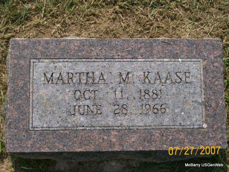 Research Note: Daughter of Carl Hemmerling and Mary Shumbach. Usual residence was Monett, MO. Martha M. Hemmerling, age 17, married Fred H. Kaase, age 24, on Sept. 12, 1899 in Barry Co., MO. Her father Carl Hemmerling, gave consent. - Kaase Plot Stone | MO Marriage Records Death Certificate Phyllis Long Photos Jay Trace |