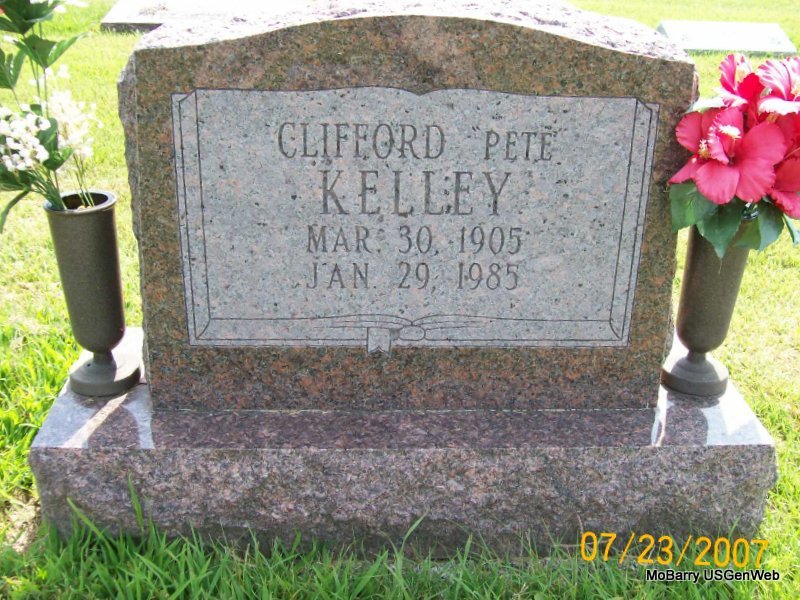 | KELLEY, Clifford "Pete" | Mar. 30, 1905 | Jan. 29, 1985 | Research Note: Son of Ambrose Kelley and Ada Belle Coatney. His wife was Ella Mae Friend. She second married Voyage Burgin and is buried in IOOF under Bergin. | Census Phyllis Long Photo Jay Trace |