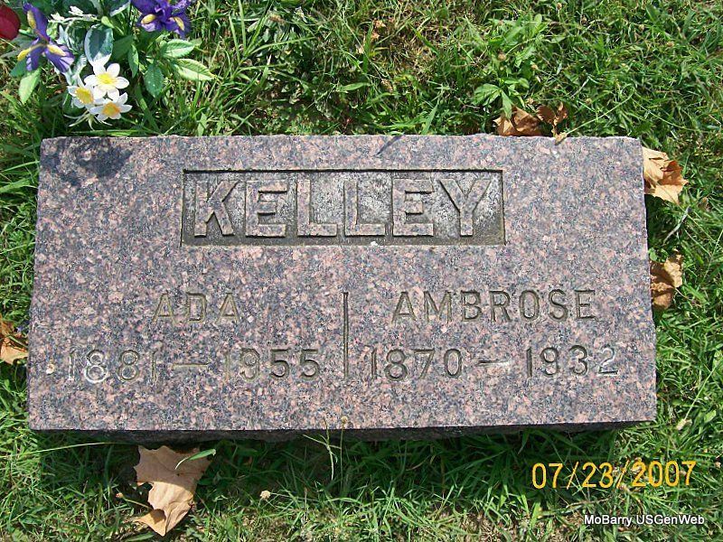 SSW: Ambrose - Research Note: Her stone has 1881 on it but her death certificate has a more exact date and gives 1880. Her mother's name was given as Becky Rhea and her father's name was listed as unknown. Ambrose Kelley was listed as her husband, deceased. Carcinoma of the breasts was given as the cause of death. Lowell Kelley, Monett, MO, gave the information. - Ada Coatney, age 19, married Ambrose Kelley, age 25, on Jan. 8,, 1899 in Barry Co., MO. Daughter of Samuel R. Coatney and Rebecca Rhea/Ray. | Death Certificate Donna Cooper MO Marriage Records Phyllis Long Photo Jay Trace |