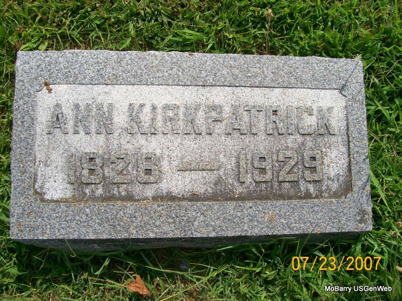 Research Note: She was buried in the J. T. Burgess plot. Her death certificate reads that her father's name was David Gray, born in OH. Her mother was given as Sarah Boggs, birth place unknown. She was widowed, age 100 years, 3 months and 7 days old. Infirmities of old age was given as the cause of death and she died at home. Mrs. John Burgess, Monett, MO, gave the information. She first married Samuel Patty. Second, Isaac Kirkpatrick. - Another Photo | Death Certificate Photo Donna Cooper Census Phyllis Long Photo Jay Trace |