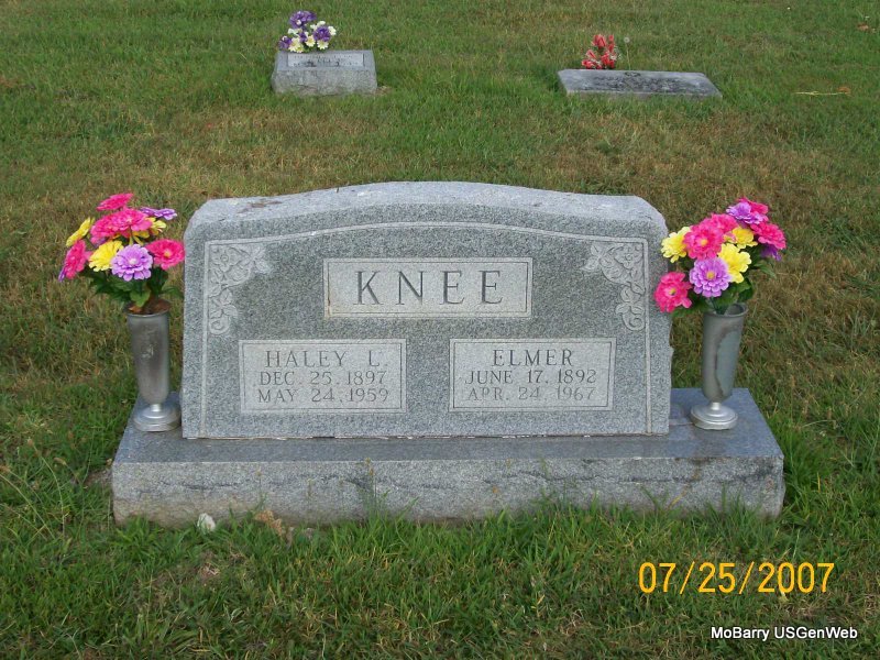 SSW: Elmer - Research Note: The cemetery log book reads that he was a veteran. Death Certificate: Haley was a female and the death certificate reads that she was never in the armed forces. Her husband was Elmer Knee. Daughter of Ed McMullin and Sarah Taylor. - Elmer Knee, age 20, married Haley McMullin, age 15, on Mar. 10, 1912 in Monett, Barry Co., MO. Mary Knee and Sarah McMullin, mothers, gave consent. | IOOF Log Book Death Certificate MO Marriage Records Phyllis Long Photo Jay Trace |