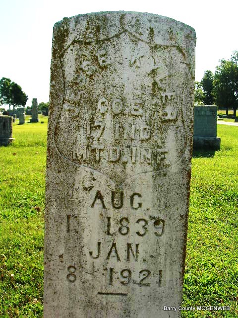 Inscription: CO E, 17 IND, MTD.INF - Research Note: According to his death certificate he had organic heart disease and at the time of his death he was age 81 years, 5 months and 6 days old. He was a stationery engineer. His father was Jesse Kyler, born OH, and his mother Amelia Page. R. B. Kyler, Monett, MO, was the informant. The cemetery log book reads that he is buried in the old section, in block 17, in lot 4 in gave 3, next to Elizabeth (Bonbrake) Kyler, his wife. The cemetery log book reads that he was a veteran. "CO E 17TH IND MTD INF. CIVIL WAR". | Death Certificate Donna Cooper IOOF Log Book Phyllis Long Photo Connie Schmidt |
