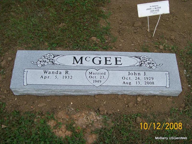SSW: Wanda R. - Inscription: "Married Oct. 23, 1949" - Research Note: He was the son of John Nelson and Geneva Jasmine (Wakely) McGee. He was a truck driver for Hutchens Asphalt Company in Cassville and served in the National Guard. He married Wanda Ruth Wesley on October 23, 1949, in Cromwell, Oklahoma. He was preceded in death by one brother, Robert McGee. - Another Photo | Monett Times Photo Jay Trace |