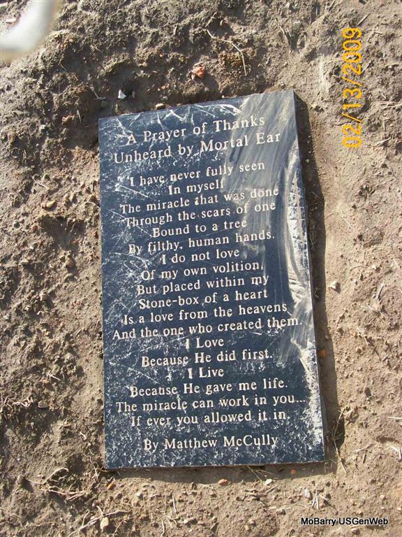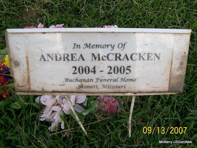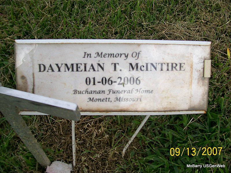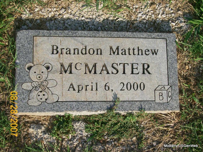 Research Note: Infant son of Roger and Mary McMaster of Wentworth, MO - Stillborn. Donna's Note: Brandon Matthew McMaster, infant son of Roger and Mary McMaster of Wentworth, was stillborn April 6 at St. John's Regional Health Care Center in Springfield. He was preceded in death by his paternal grandmother, Frances Wood; and his maternal grandmother, Joan Ball. Donna's Note: He is buried next to Joan Ball. | Monett Times Apr. 10, 2000 Mary Homesley Note Donna Cooper Photo Jay Trace |