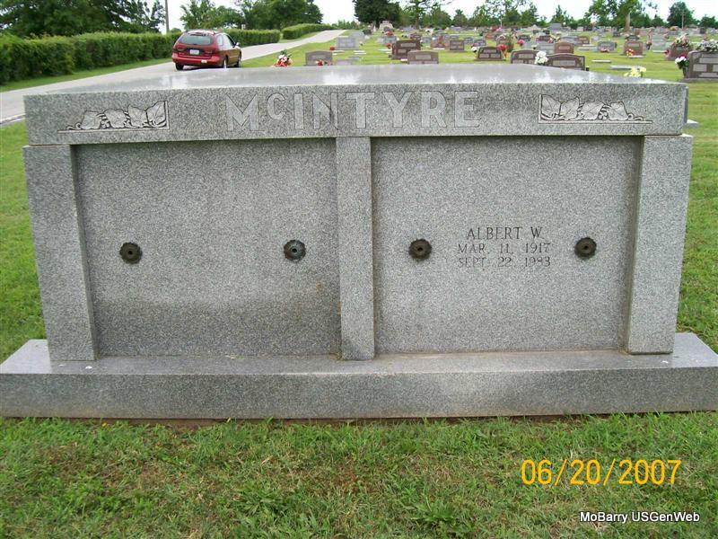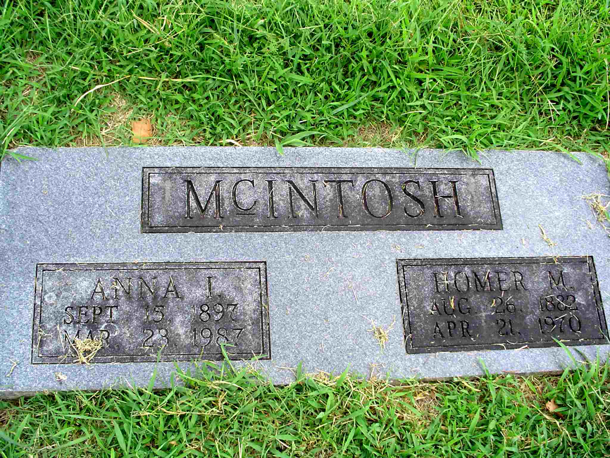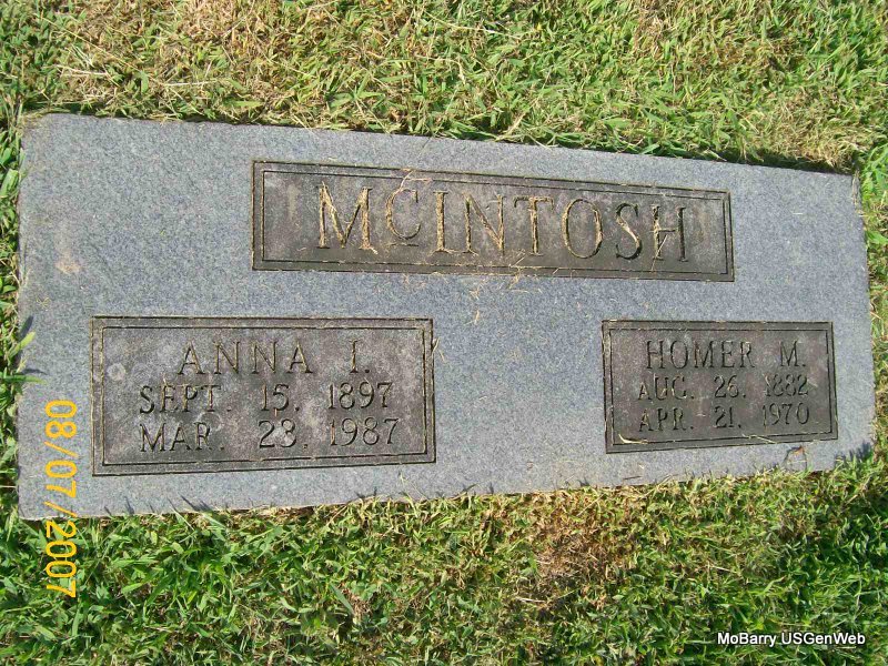 | MCINTOSH, Anna I. | Sept. 15, 1897 | Mar. 23, 1987 | SSW: Homer M. - Research Note: Second wife of Homer. - McIntosh Plot Stone - Plot Stone - Another Photo | Online Newspapers Phyllis Long Photo Donna Cooper Photo Jay Trace |