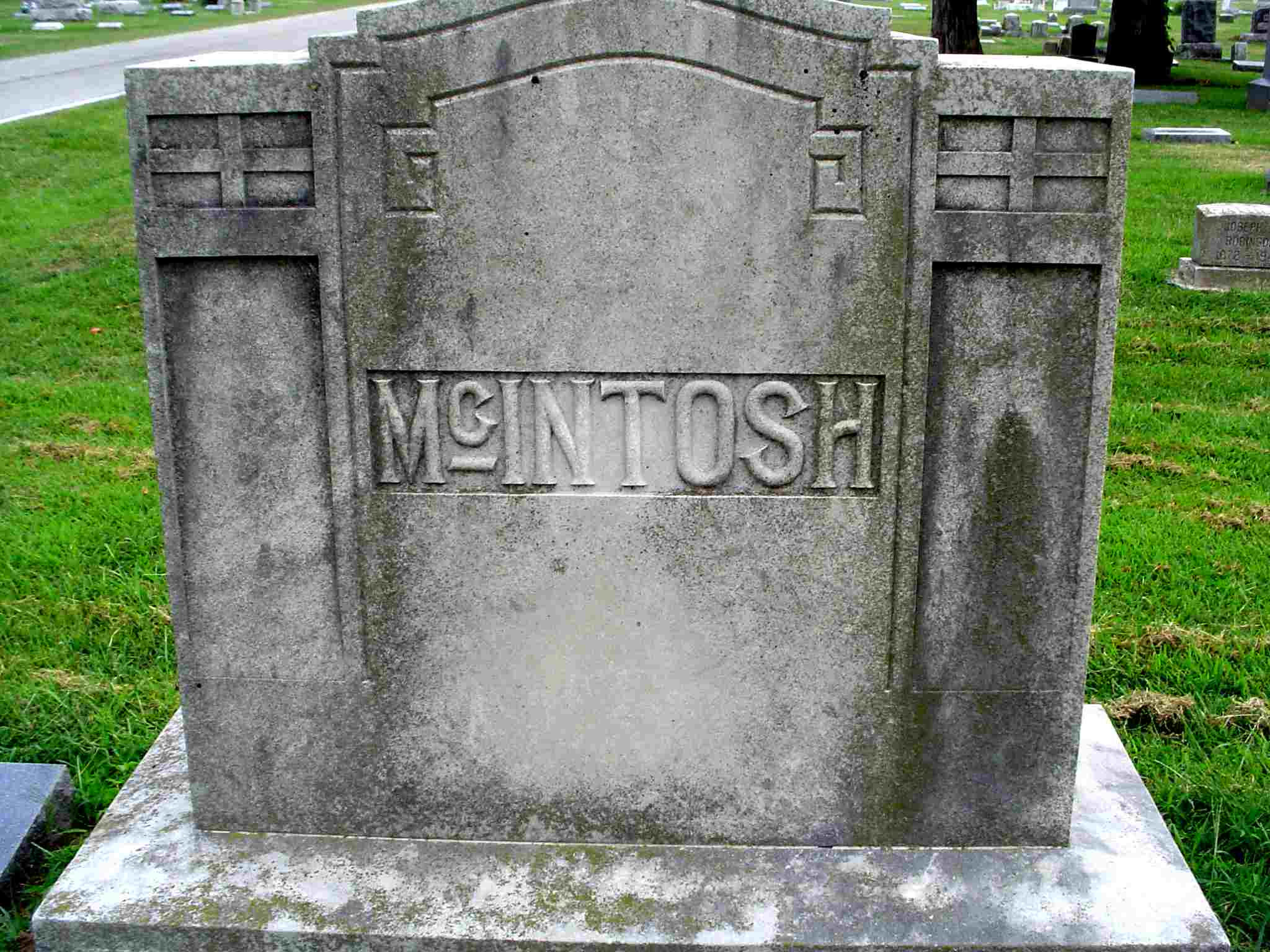 Inscription: "Wife of H. M. McIntosh" - Research Note: Her death certificate is one that can't be viewed on line. David A. Peters purchased her cemetery lot and she is buried next to the David A. Peters family. First wife of Homer Melville McIntosh. Daughter of David A. Peters and Martha Jane Chapman, both buried at IOOF cemetery. | Note Photo Donna Cooper Photo Jay Trace |