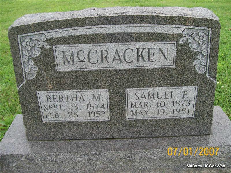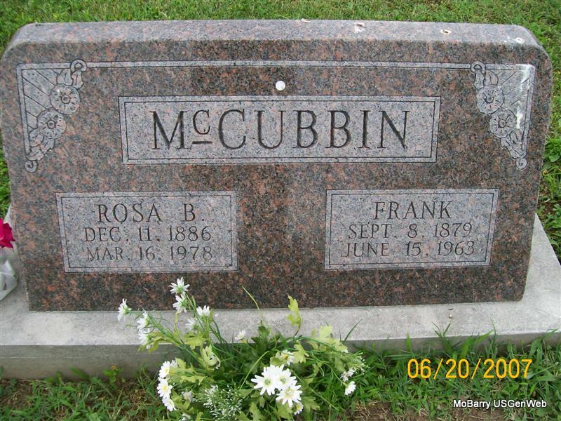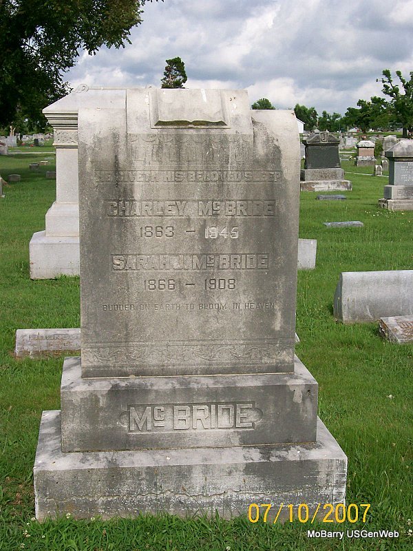 SSW: Charley - Research Note: The cemetery log book has that she was buried on Nov. 15, 1908 and that Charley McBride purchased the lot. In the Callaway Funeral Home records she is listed as Sadie McBride, husband Charles McBride, and died of consumption. She was age 42 years, 4 months and 3 days old when she died. Her birth date and her parents names weren't given. - Charles McBride married Sadie Johnson on Apr. 1, 1883 in Barry Co., MO. Daughter of Joseph Morris Johnson and Emily Bennett. | Callaway Funeral Home Photo Donna Cooper MO Marriage Records Census Phyllis Long Photo Jay Trace |