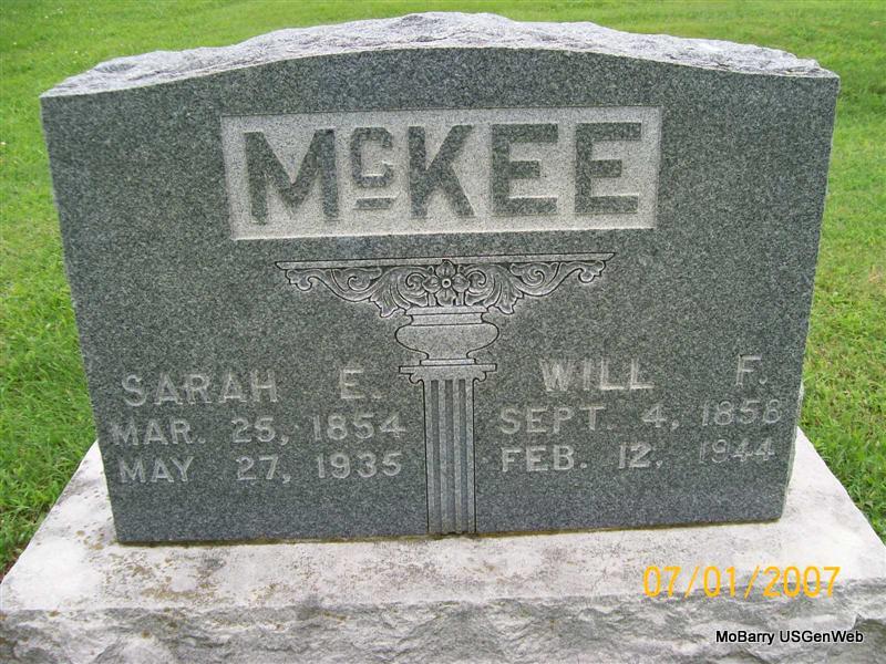 SSW: Sarah E. - Research Note: His death certificate reads that he was a retired building contractor. His father was Alexander Franklin McKee, his birth place, and his mother's name and her birth place was unknown to the informant. He had lived in the Monett, MO, community for over 50 years. He was age 85 years, 5 months and 8 days old when he died. His wife was deceased and her name was Sarah (Moorman) McKee. He had been married and widowed two times. The cause of his death was bronchio pneumonia. Callaway Funeral Home buried him Feb. 14, 1944 in IOOF Cemetery. All census gives his father as Alexander H. McKee and mother Sybilla Louisa Whisler. | Death Certificate Donna Cooper Census Phyllis Long Photo Jay Trace |