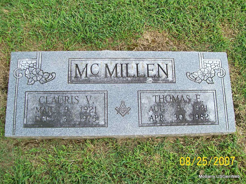 | MCMILLEN, Clauris Virginia (MCCASLIN) | Mar. 9, 1921 | Dec. 3, 1975 | SSW: Thomas E. - Research Note: Daughter of Oscar Bruce McCaslin and Pearl Mae Bridges. | Census Phyllis Long Photo Jay Trace |