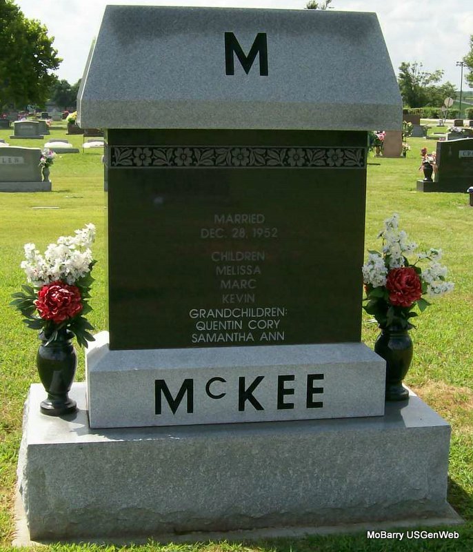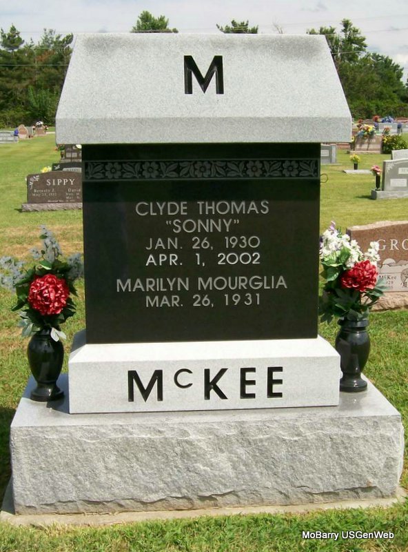 SSW: Marilyn Mourglia - Inscription: "Married Dec. 28, 1952" - Research Note: Clyde "Sonny" McKee, age 72, of Kansas City, formerly of Monett, died at 1:55 p.m. April 1 at Timber Lake Health Care in Kansas City following a long illness. He was born January 26, 1930, in Kansas City, and was a son of Clyde and Lorraine (Craig) McKee. He was a 1948 graduate of Monett High School and a 1952 graduate of Drury College. He married Marilyn Mourglia on December 28, 1952, in Monett. - Back of Stone | Monett Times April 3, 2002 Donna Cooper Photo Jay Trace |