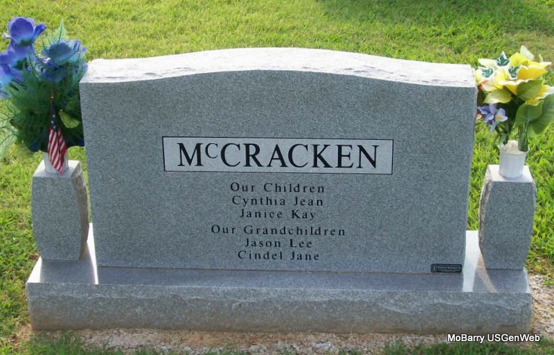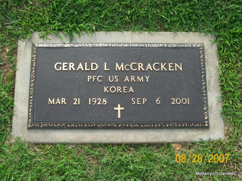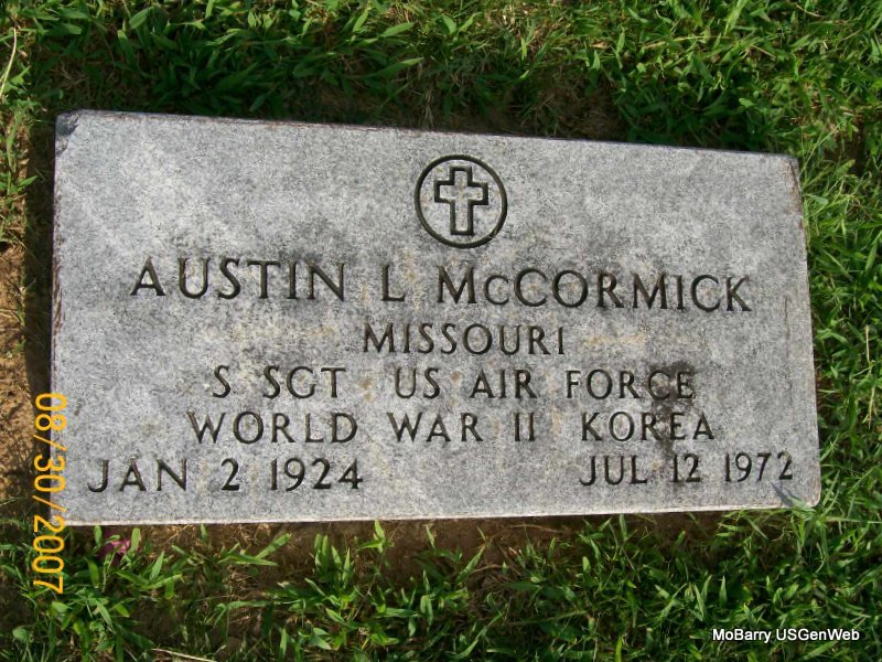 | MCCORMICK, Austin, L. | Jan. 2, 1924 | July 12, 1972 | Inscription: "MISSOURI S SGT US AIR FORCE WORLD WAR II KOREA" - Research Note: 1940 Census, Monett, Barry, Missouri - Maud McCormick, head, age 39, divorced, born MO, hotel waitress; June, daughter, age 20, born MO; Austin, son, age 16, born MO. | Census Phyllis Long Photo Jay Trace |