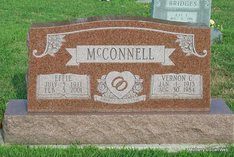 | MCCONNELL, Vernon Clyde | Jan. 1, 1913 | Aug. 30, 1984 | SSW: Effie - Inscription: "Married Oct. 3, 1936" - Research Note: Son of James Simeon McConnell and Edith Susan Mashburn. | Census Phyllis Long Photo Jay Trace |