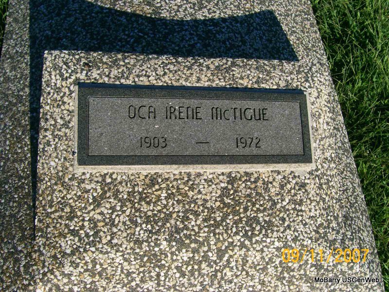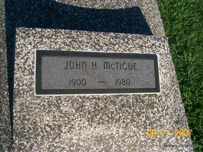 | MCTIGUE, John H. | 1900 | Feb. 1980 | SSW: Oca Irene - Research Note: According to the City of Monett cemetery log book he was buried Feb. 15, 1980 in a cemetery lot owned by John McTigue. WW I Reg. gives his nearest relative as his mother, Mrs. F. E. McTigue. He was working for the railroad. - 1900 Census, Nashville Ward 2, Davidson, Tennessee - John McTigue, head, born 1851, TN, age 49, clerk; Fannie, wife, born Oct. 1872 TN, age 27, married 1 year, mother of 3 children, 1 living, dress maker; Annie Shanklin, step-daughter, born Feb. 1897 TN, age 3. - 1910 Census, Springfield Ward 2, Greene, Missouri - Fred C. Hofmeister, head, age 37, married twice, 0 years in present marriage, born Germany, merchant; Fannie, wife age 37, married twice, 0 years in present marriage, born TN, parents born TN; Annie McTigue, step-daughter, age 13, born TN; John McTigue, step-son, age 10, born TN, parents born TN. - Fannie McTigue, age 37 married Fred C. Hofmeister, age 37 on Nov. 1, 1909 in Foreman, Little River Co., AR. - 1920 Census, Monett Ward 3, Barry, Missouri - Mrs. F. E. Turner, head, age 42, widowed, born TN, ran a rooming house; John H. McTigue, son, age 20, born TN, father born NJ, mother TN, working for the railroad. - John H. and Fannie E. McTigue were in Nashville, TN in 1908 city directories. Probably parents of this John H. McTigue. | IOOF Log Book Donna Cooper Census WW I Draft Reg. Phyllis Long Photo Jay Trace |
